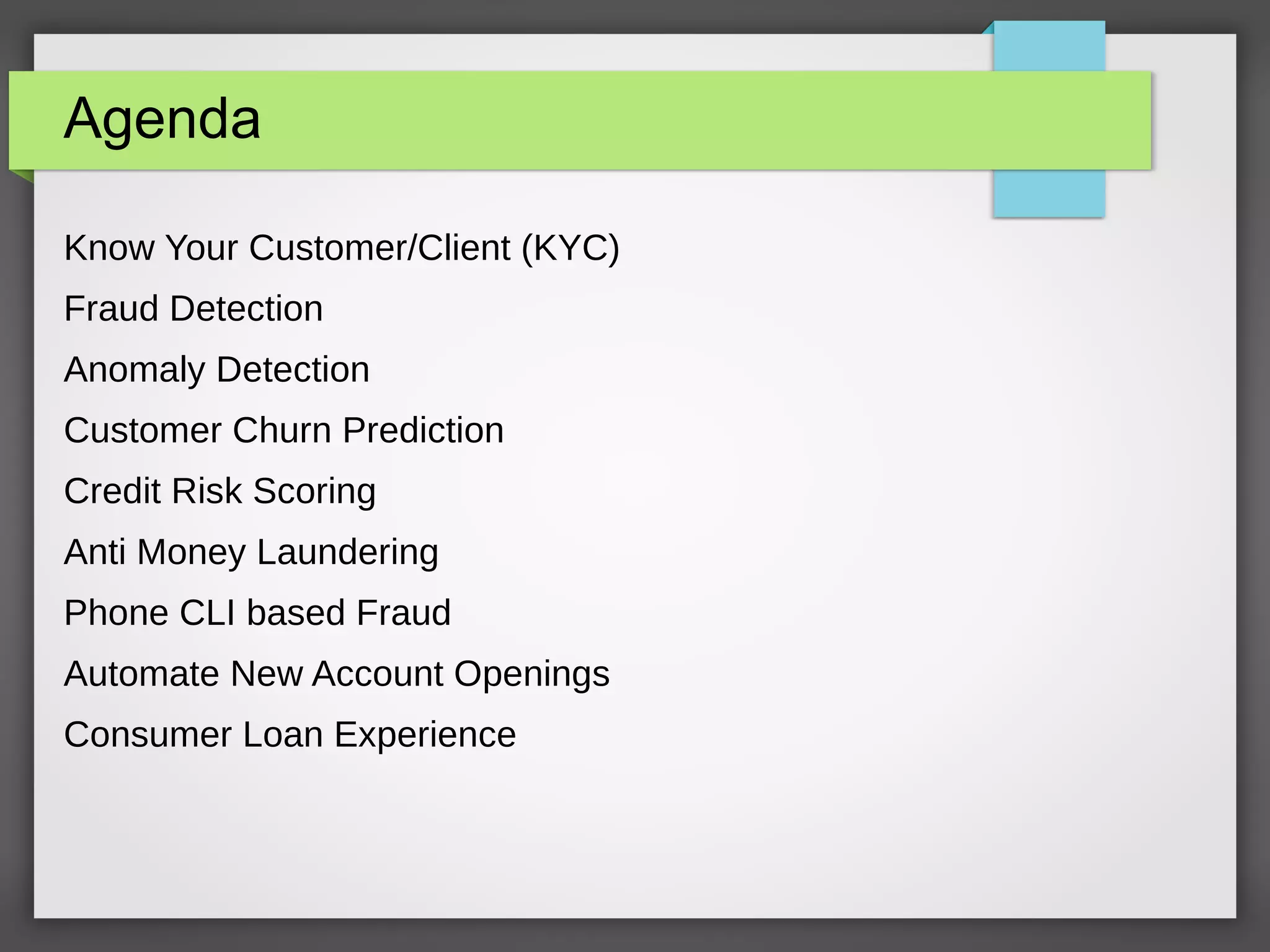 1) Know Your Customer/Client (KYC) and fraud detection using machine learning to analyze transactions and communications.