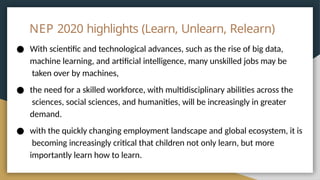 The document discusses the role and impact of artificial intelligence (AI) in education, emphasizing the necessity for a skilled workforce that can adapt to technological advances. It outlines AI applications in personalized learning, education management, and assessment, highlighting their potential to enhance accessibility and tailor learning experiences for students. Ethical concerns regarding AI in education are also addressed, stressing the importance of fairness, transparency, privacy, accountability, and safety.
