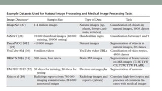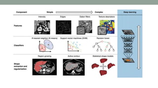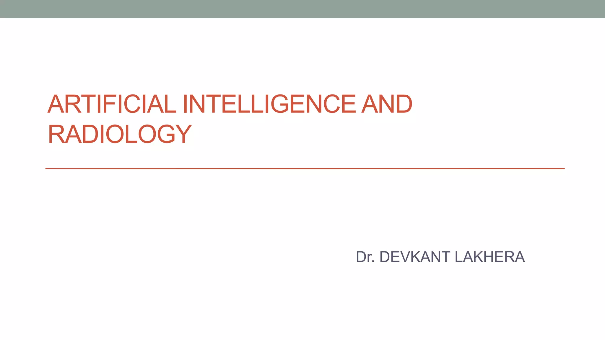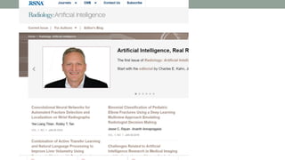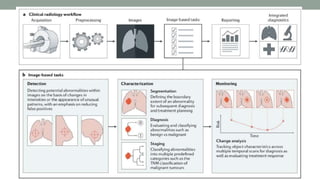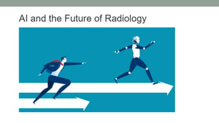 This document discusses artificial intelligence and its applications in radiology. It begins with definitions of artificial intelligence and its subsets of machine learning and deep learning. It then discusses how machine learning and deep learning are being used in medical imaging for tasks like cancer diagnosis and detection of findings in images. The document outlines how large amounts of medical image and patient data are being used to train AI models to perform tasks like segmentation and anomaly detection. It provides examples of startups and projects applying AI to problems in radiology. It concludes by discussing views on AI in radiology, noting that AI can increase radiologist efficiency and consistency if integrated into the workflow, rather than replacing radiologists.