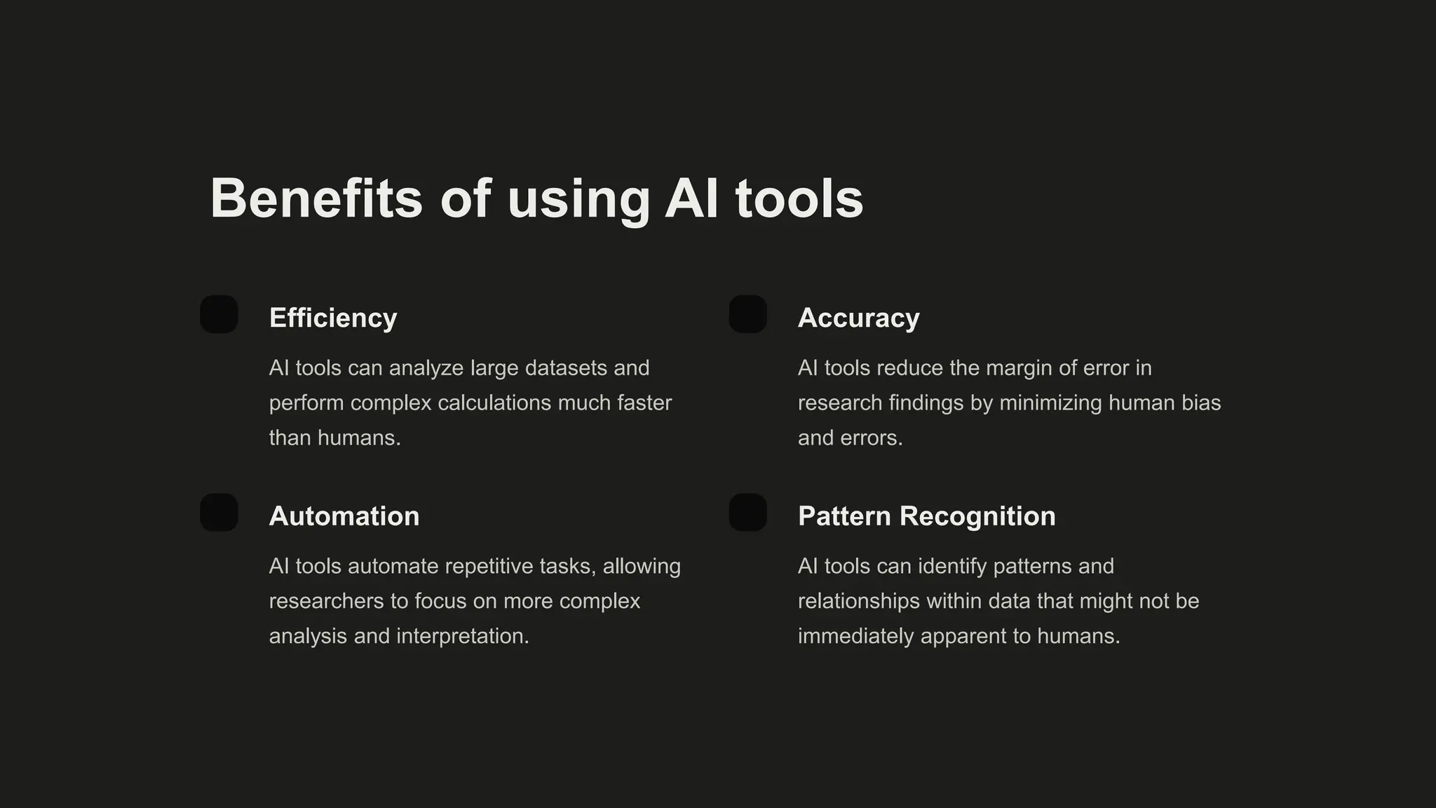 AI tools play a pivotal role in modern research by enabling researchers to efficiently process vast datasets, uncover meaningful insights, and accelerate scientific discovery. They can analyze large datasets and perform complex calculations much faster than humans. While offering benefits, AI tools also face challenges including ensuring data quality and model interpretability. Going forward, automated research assistants and explainable AI may help address current limitations and further the potential of AI in research.