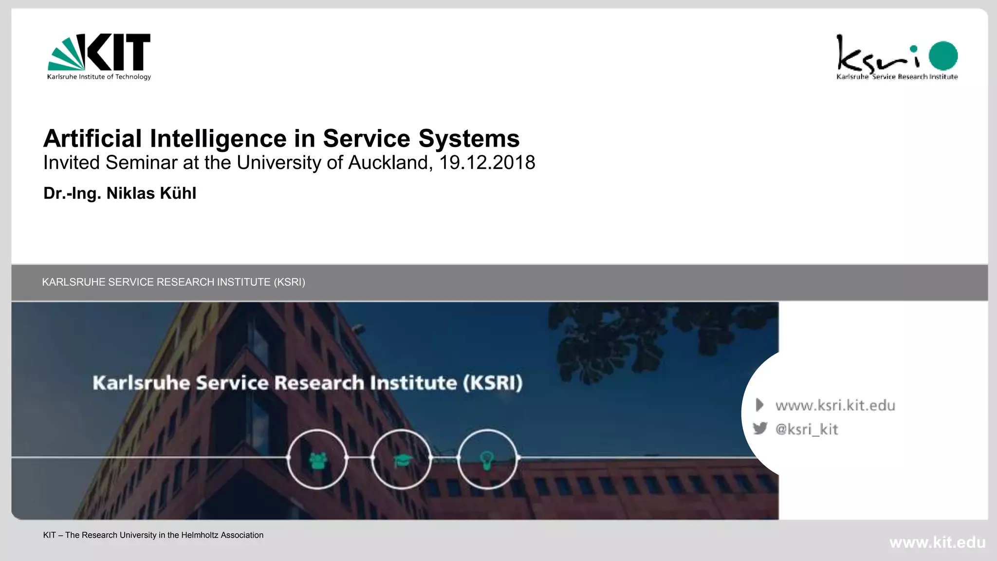 The document presents an overview of the Karlsruhe Institute of Technology (KIT) and its Karlsruhe Service Research Institute (KSRI), detailing its focus on artificial intelligence in service systems. It highlights various research areas, including needmining, advanced analytics, and system-oriented service delivery, aimed at innovative solutions in digital service innovation. The research addresses crucial challenges in utilizing AI for service optimization while ensuring privacy and effective predictive modeling across industries.