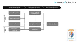 The document discusses the implications of artificial intelligence (AI) on software testing and quality assurance, highlighting the need for intelligent self-learning platforms. It emphasizes the shift from traditional testing to a focus on experience and the integration of AI in testing practices, predicting that AI will create significant economic value in the near future. Additionally, it notes the challenges South African companies face due to legacy systems and the necessity for investment in AI technologies to prepare for the ongoing revolution in this field.