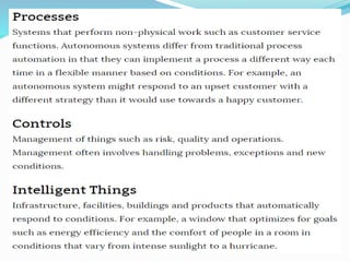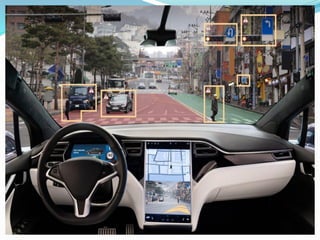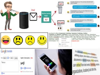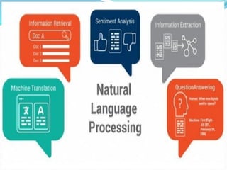 The document discusses various applications of artificial intelligence (AI), including chatbots, computer vision, weather predictions, and self-driving cars. It then focuses on chatbots, explaining that they are powered by natural language processing (NLP) to understand human language. The document outlines different types of chatbots, including rule-based and machine learning-based chatbots. It provides examples of how NLP is used for tasks like text summarization, information extraction, and sentiment analysis. NLP allows machines to understand human language in both written and spoken forms.