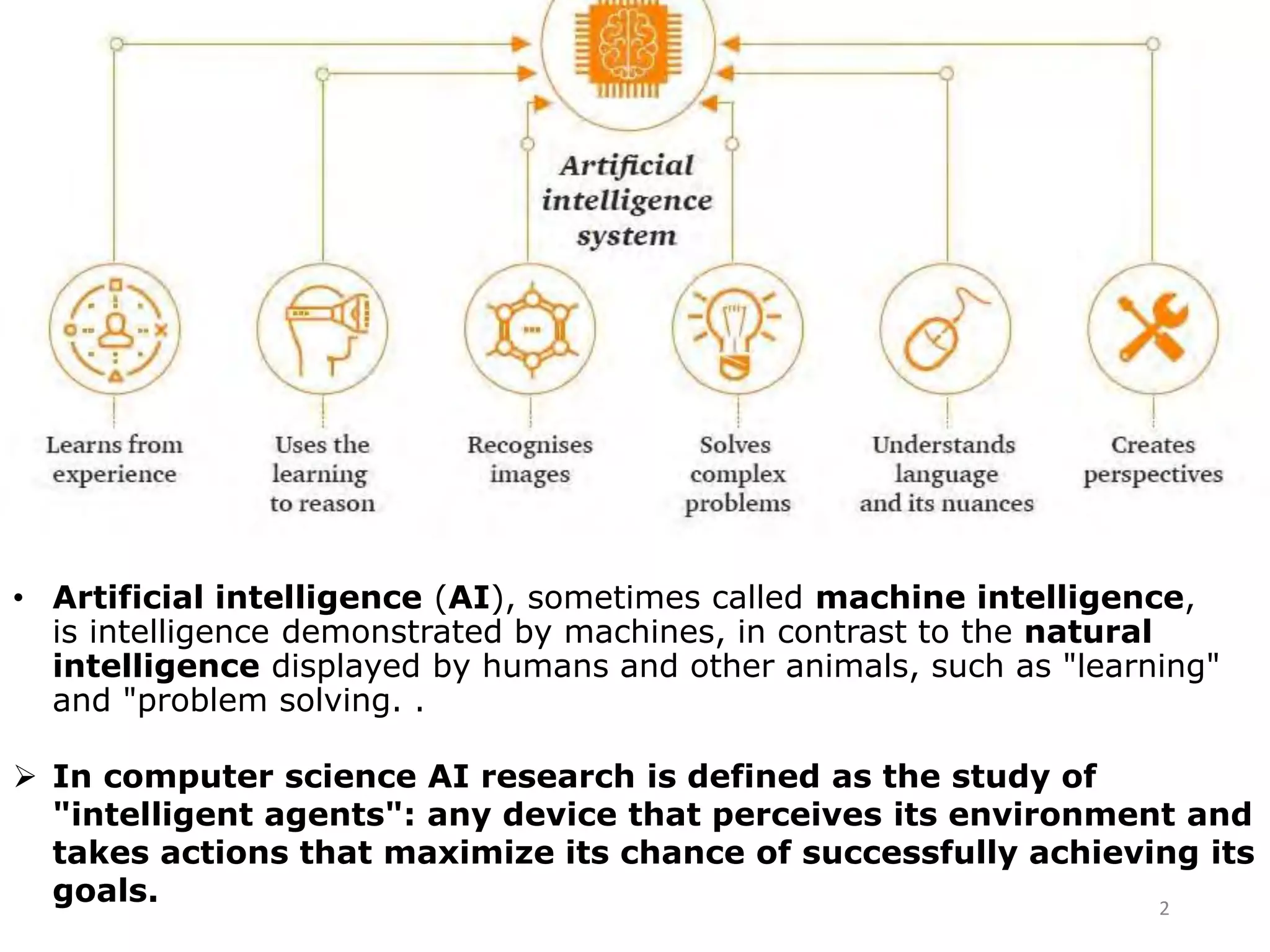 Artificial intelligence (AI) is the study of intelligent agents that perceive their environment and take actions to maximize their chances of achieving their goals. There are several key areas of AI research including problem solving, machine learning, natural language processing, computer vision, and robotics. Neural networks provide a way to represent knowledge that is inspired by the human brain - data is fed through a network of nodes that can strengthen or weaken connections to learn from examples. While narrow AI has achieved success in specialized tasks, the long term goal is to create general artificial intelligence that can match or exceed human abilities across a wide range of cognitive tasks.