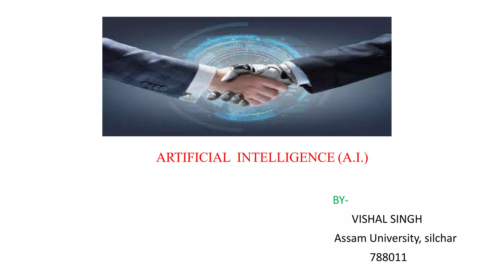The document provides an overview of artificial intelligence (AI). It defines AI as the study of computer systems that attempt to model human intelligence. The early history of AI is discussed, noting Alan Turing's 1950 paper that asked if machines can think. The current status of AI includes intelligent personal assistants on mobile devices, as well as applications in video games, navigation, robotics, and deep learning. Key challenges for AI are computing power, intuitive thinking, and judgment. The future of AI is seen in self-driving cars, improved healthcare, and new areas of exploration.