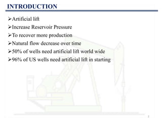 This document discusses various artificial lift methods used to increase production from oil and gas wells as reservoir pressure declines. It describes the basic principles and components of common artificial lift techniques, including sucker rod pumps, gas lift, electrical submersible pumps, hydraulic jet pumping, plunger lift, and progressive cavity pumping. For each method, it provides information on advantages, limitations, and typical application ranges for operating parameters such as depth, production rate, temperature, and wellbore geometry. The document aims to provide an overview of different artificial lift options and considerations for selecting the appropriate production method.
