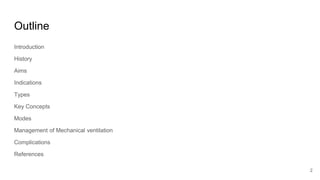 Artificial Ventilation is a method of assisting or replacing spontaneous breathing using a mechanical ventilator. It has a long history dating back to ancient times and was widely used during polio outbreaks. There are two main types - negative pressure ventilation which uses vacuum pressure and positive pressure ventilation which delivers gas via endotracheal tube. Modes include controlled mandatory ventilation where the machine does all breathing, assisted modes where the patient can trigger breaths, and pressure support where the patient determines breathing rate and depth. Key goals are to improve oxygenation and ventilation. Complications can include barotrauma, infections, and ventilator dependence. Proper use and monitoring can greatly impact patient outcomes.