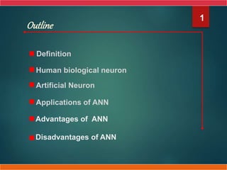 This document provides an introduction to artificial neural networks (ANNs). It defines ANNs as systems inspired by the human brain that are composed of interconnected nodes that can learn relationships from large amounts of data. The document outlines the key components of ANNs, including artificial neurons, weights, biases, and activation functions. It also discusses how ANNs are trained, their advantages like parallel processing and fault tolerance, and applications in areas like pattern recognition, speech recognition, and medical diagnosis. Finally, it acknowledges some disadvantages of ANNs and discusses future areas of development like self-driving cars.