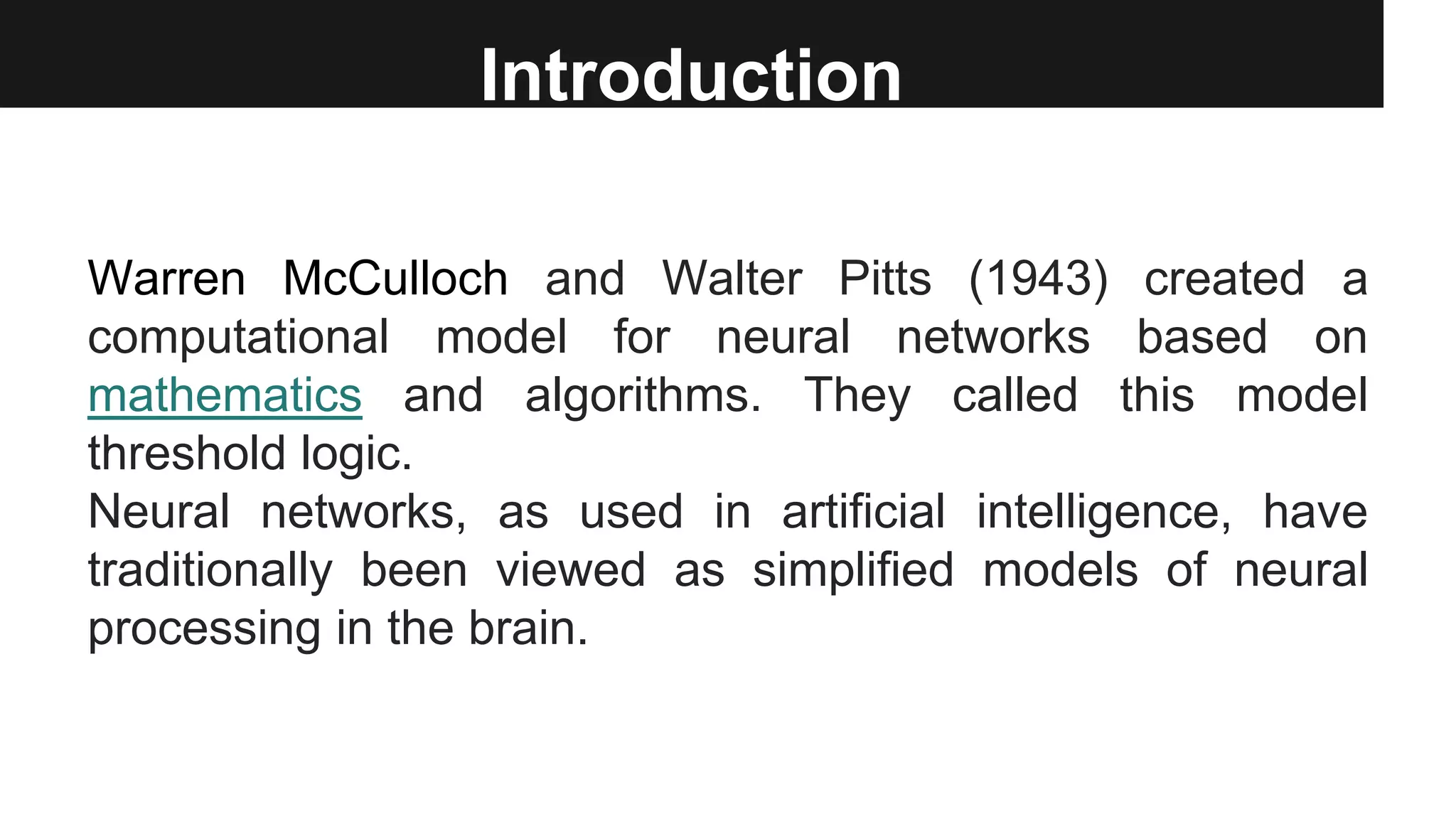 The document discusses the development of artificial neural networks (ANNs) by Warren McCulloch and Walter Pitts in 1943, introducing concepts such as threshold logic and perceptrons. It explores various learning methods including gradient descent and backpropagation, focusing on reducing error in ANN models through multilayer structures. Additionally, it briefly covers online and offline learning, as well as the evolution of spiking neural networks as a more advanced form of ANN.