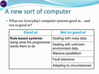 An artificial neural network (ANN) is a machine learning approach that models the human brain. It consists of artificial neurons that are connected in a network. Each neuron receives inputs and applies an activation function to produce an output. ANNs can learn from examples through a process of adjusting the weights between neurons. Backpropagation is a common learning algorithm that propagates errors backward from the output to adjust weights and minimize errors. While single-layer perceptrons can only model linearly separable problems, multi-layer feedforward neural networks can handle non-linear problems using hidden layers that allow the network to learn complex patterns from data.
