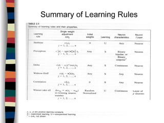 The document discusses various neural network learning rules: