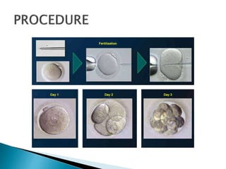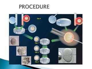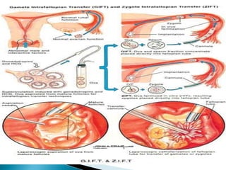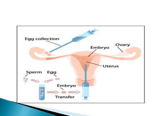 This document discusses various assisted reproductive technologies (ART) including artificial insemination, in vitro fertilization, and surrogacy. It describes procedures like intrauterine insemination where washed sperm is injected into the uterus using a catheter. In vitro fertilization involves fertilizing eggs and sperm outside the body then transferring the embryos into the uterus. Surrogacy is when another woman carries and delivers a baby for an infertile couple. The document provides details on different ART procedures and their techniques.