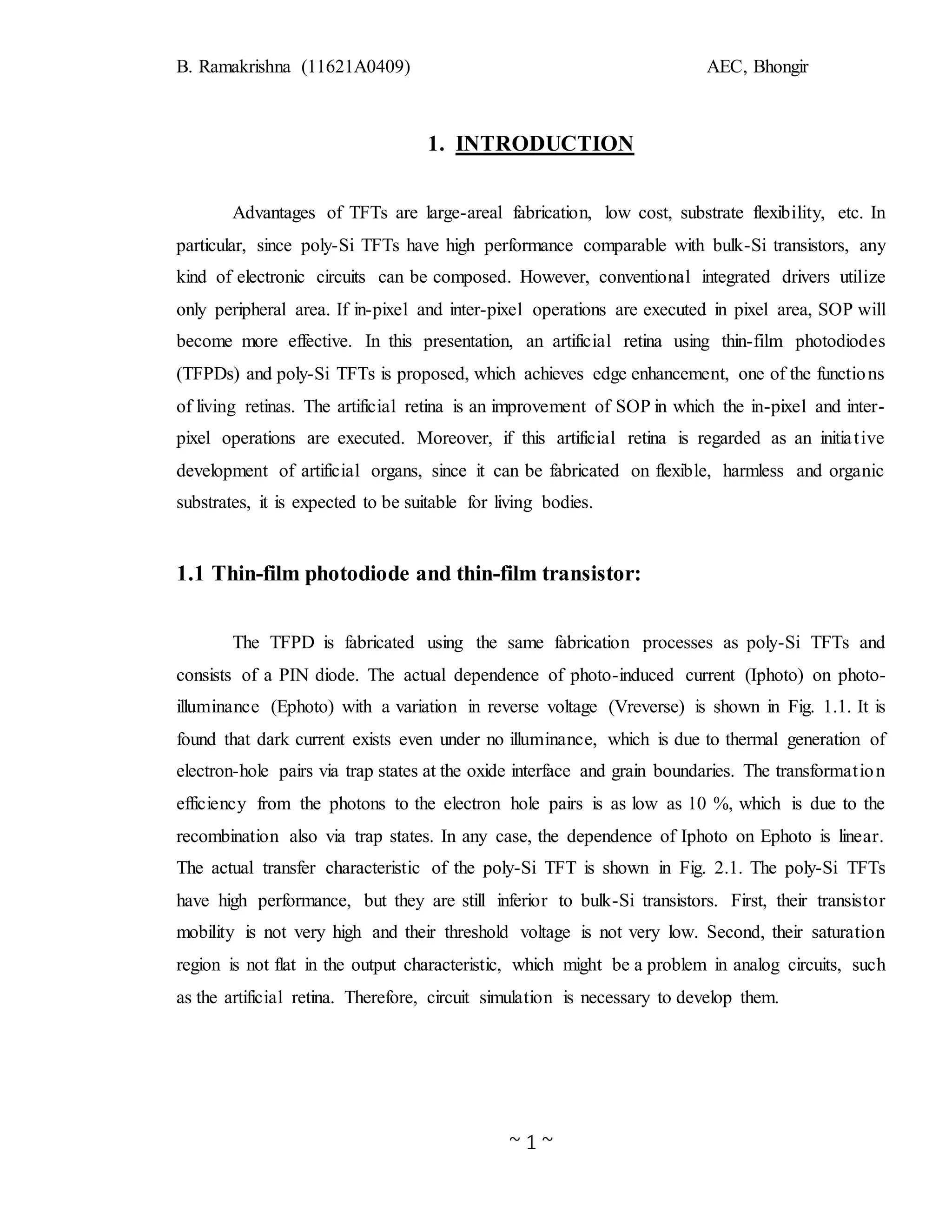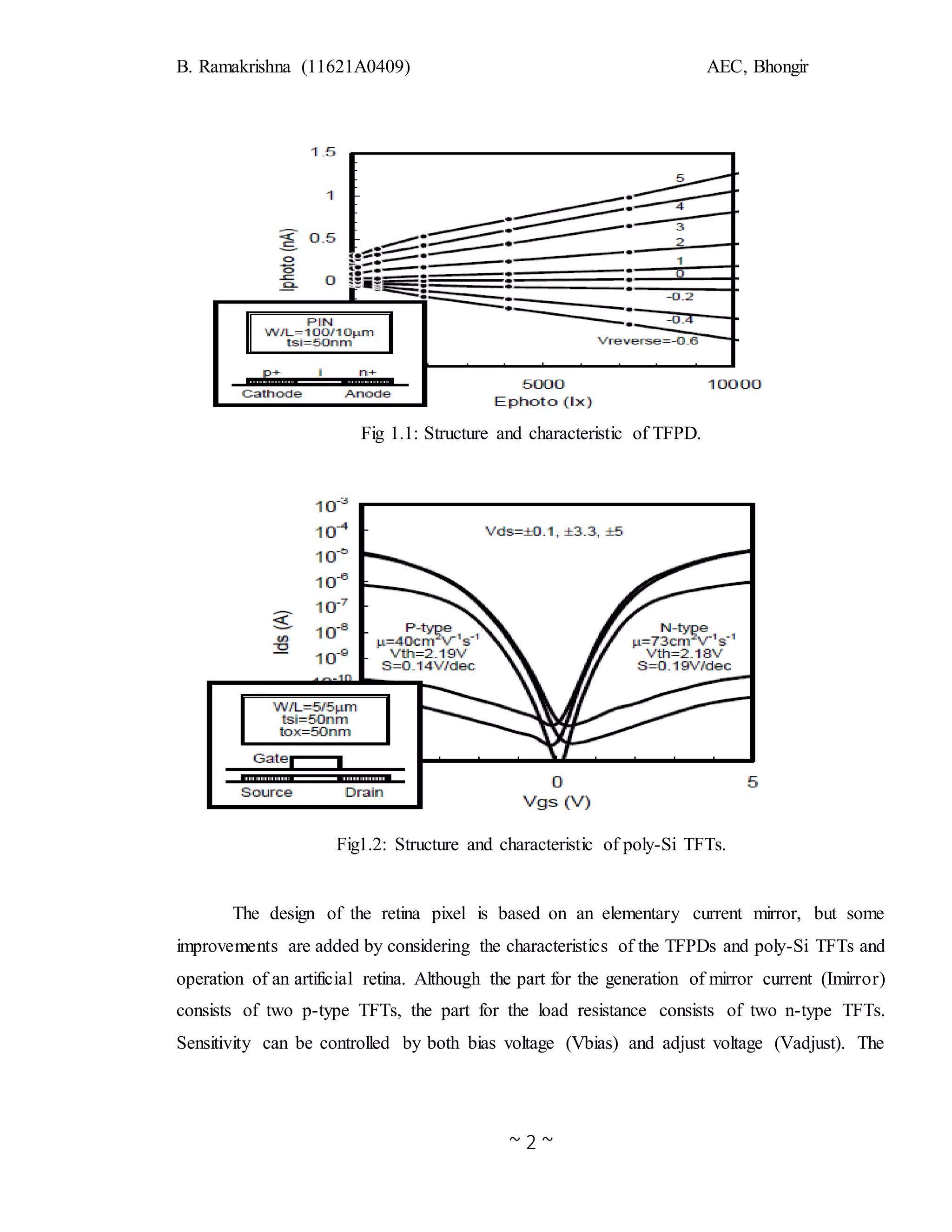 The document describes an artificial retina that uses thin-film photodiodes and poly-silicon thin-film transistors. It is fabricated on transparent and flexible substrates to mimic the functions of a natural retina. The artificial retina achieves edge enhancement through a circuit design that processes signals from the photodiodes through current mirrors and load resistances. It can be implanted inside the eye through either epiretinal or subretinal implantation methods to help restore sight for those who have lost vision due to retinal damage or disease.