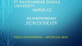 The document discusses tissue engineering and artificial skin. It describes how the first artificial skin was invented using collagen fibers and sugar molecules to form a porous material resembling skin. It also outlines the structure of human skin and importance of skin. The key developments in artificial skin are explained, including using a small skin sample to grow enough skin to cover the body in 3 weeks. The document details the methods used to produce artificial skin, including using mesh scaffolds or collagen gels with fibroblasts and keratinocytes to form layers resembling skin. Future developments aim to produce fully functional lab-grown skin grafts.