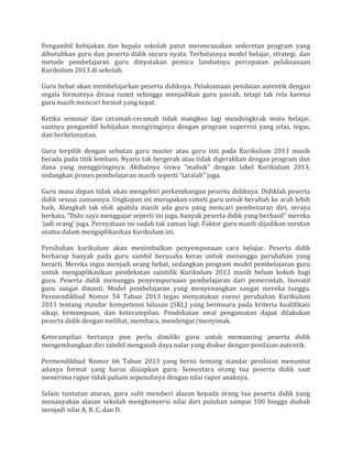 Kurikulum 2013 atau Pendidikan Berbasis Karakter merupakan kurikulum baru yang mengutamakan pemahaman, keterampilan, dan pendidikan berkarakter. Kurikulum ini menggantikan Kurikulum Tingkat Satuan Pendidikan sejak 2006 dan menerapkan pendekatan saintifik serta menuntut siswa untuk mampu menulis dan berbicara secara ilmiah. Implementasi Kurikulum 2013 masih menemui hambatan karena keterbatasan guru dalam merealisasikan pendekatan baru ini