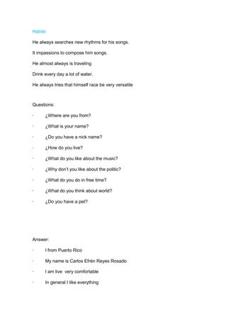 Carlos Efrén Reyes Rosado is a 20-year-old musician from Puerto Rico known as Farruco. He enjoys composing songs, traveling the world, and spending time with family and friends. Farruco dislikes when events are cancelled as it gives artists a bad impression. In his free time, he focuses on finding new rhythms, composing music, and staying versatile in his work.