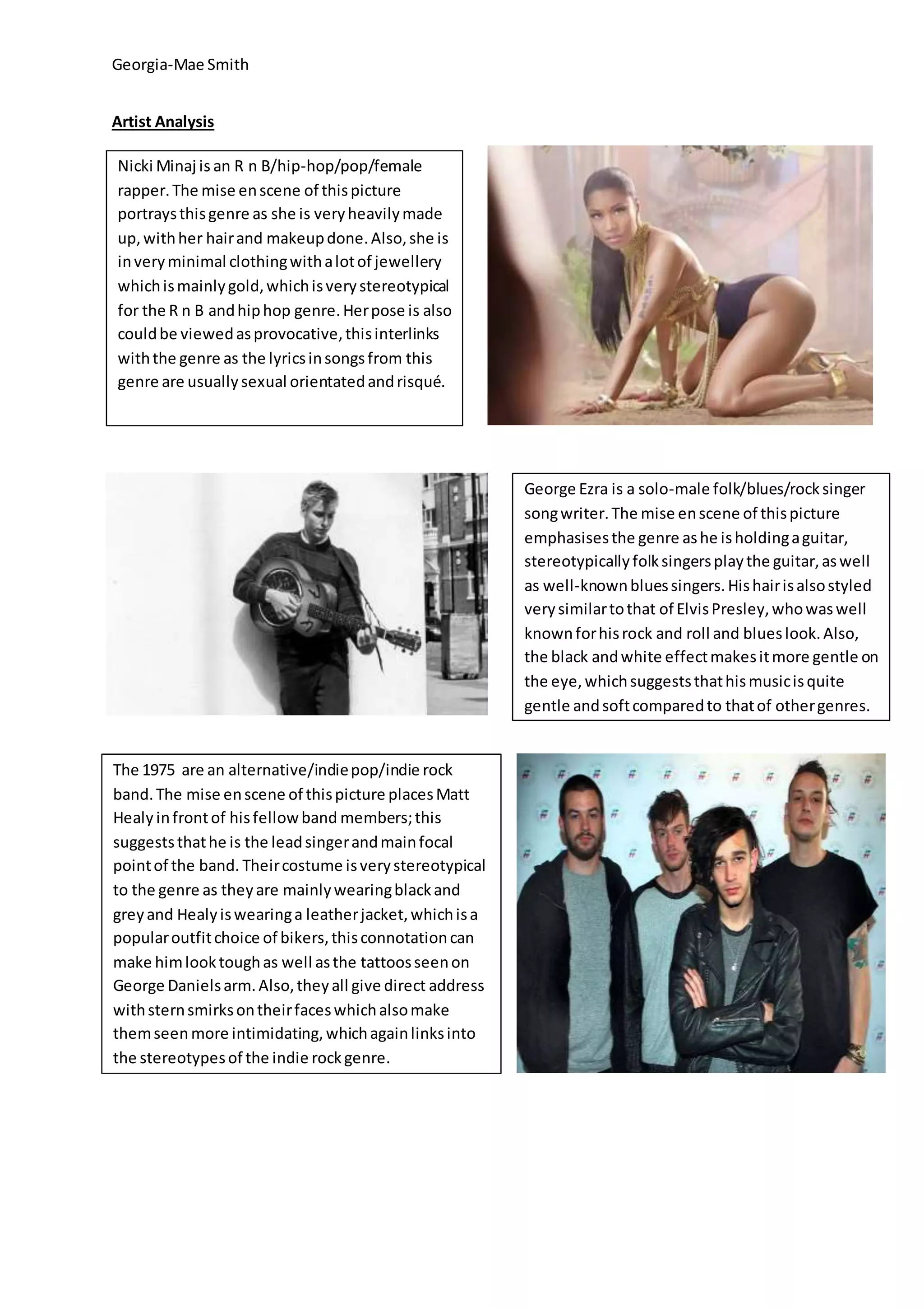 This document analyzes the mise-en-scene of photographs of various musical artists and relates visual elements of the photographs to the genres of music represented. It discusses photographs of Nicki Minaj representing her hip-hop/R&B genre through her heavy makeup, minimal clothing, and provocative pose. A photo of folk/blues singer George Ezra is described as emphasizing his genre through his guitar and Elvis-inspired hair and the black-and-white effect suggesting gentler music. The 1975 photo places the lead singer front and center in black and grey clothing with tattoos, conveying an intimidating indie rock style.