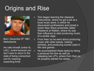 Tom began learning classical instruments and discovered synthesizers while working at a music store. He joined a band and began producing music and remixes, releasing two albums. He then focused on composing scores for films and games. Throughout his career he has maintained an electronic style while exploring different genres and focusing more recently on major film scores, receiving widespread critical acclaim for his work on films like Mad Max and Deadpool.