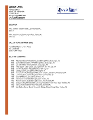 Joshua Lance is an artist based in Santa Fe, New Mexico. He received a BA in art from Montclair State University in 1993 and an AA in art from Mercer County Community College in 1991. His work has been shown in galleries across the United States, including solo exhibitions in Philadelphia and New Jersey. He is currently represented by the Hueys Fine Art gallery in Santa Fe.