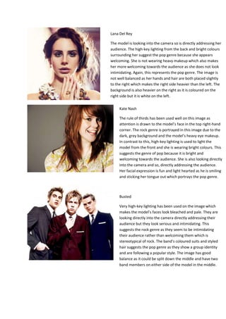 This document analyzes and summarizes images of several musical artists, describing how elements of the images portray either the pop or rock music genres. For each image, it discusses aspects like lighting, positioning of subjects, colors, facial expressions and whether the image is balanced. Key elements that suggest pop include bright colors, high-key lighting, relaxed settings and direct eye contact with the audience. Features tied to rock include dark colors, serious expressions and intimidating postures. The document examines how various compositional techniques and stylistic choices in the photos communicate the genres associated with each musical act.