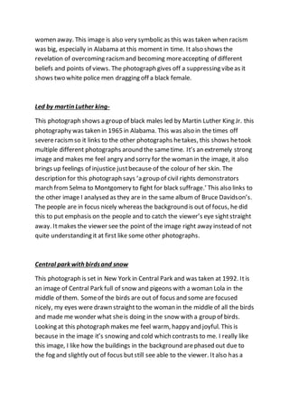 This document provides summaries of several photographs taken by artists Bruce Davidson and Boogie. It summarizes Bruce Davidson's 1986 photograph of the Statue of Liberty between two skyscrapers, showing the height of the statue. It also summarizes his 1963 photograph taken in Alabama showing the arrest of a black demonstrator during a time of major segregation and racism. Finally, it summarizes photographs by Boogie showing men holding guns and blurred faces in Brooklyn, emphasizing violence in the area through a focus on the weapons.