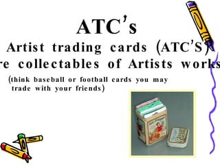Artist trading cards, or ATCs, are small collectible artworks typically measuring 2.5 by 3.5 inches that artists create and trade with one another rather than sell. The concept originated in 1997 in Zurich when an artist introduced the idea to a colleague, and they developed minimal rules and endless possibilities for the small artworks including using various materials and creating originals, editions, series, and signature cards about the artist.