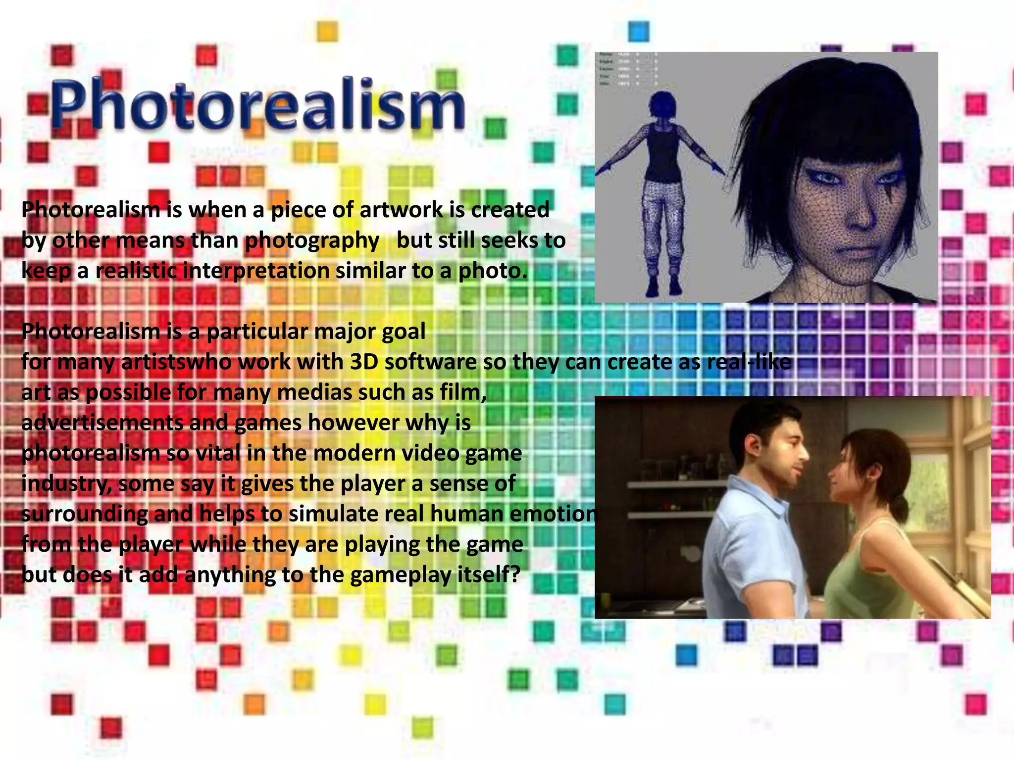 The document discusses different art styles used in video games, including photorealism, cel shading, stylized, abstract, and exaggerated styles. Photorealism aims to make games look as realistic as possible, but may limit creativity. Cel shading uses flat colors instead of smooth lighting to create a distinctive look. Stylized and exaggerated styles cartoonize proportions while keeping some realism. Abstract art employs shapes and colors without realistic resemblance. Each style suits different genres and gameplay.