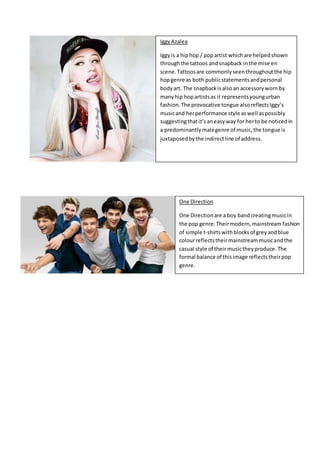 The document discusses and analyzes images of 5 musical artists/bands - You Me At Six, Foster the People, Max Milner, Iggy Azalea, and One Direction - and summarizes how elements of each image reflect the genre of music they create. For You Me At Six, their black clothing and denim jackets reflect the rock genre. Foster the People's casual indie style of baggy t-shirts and skinny jeans represent their indie pop genre. Max Milner's guitar and old TV suggest his singer-songwriter style. Iggy Azalea's tattoos and snapback represent hip hop fashion. One Direction's simple t-shirts and formal balance reflect their mainstream pop genre.