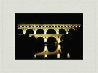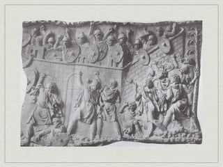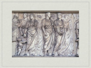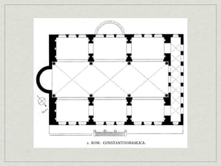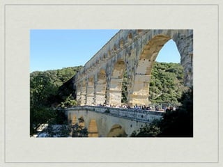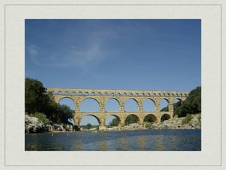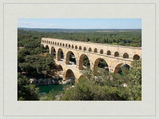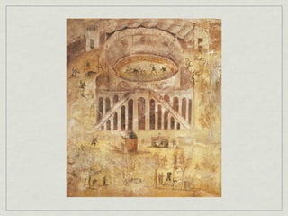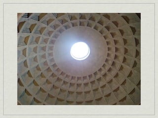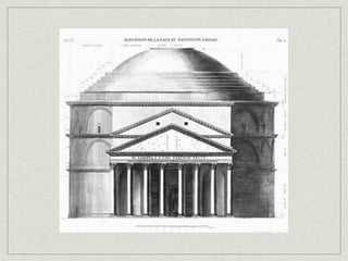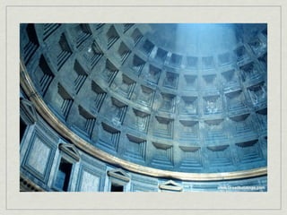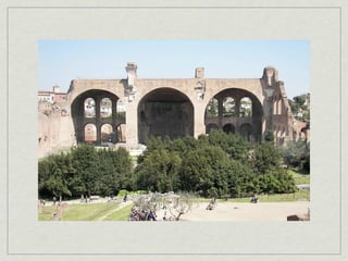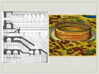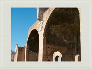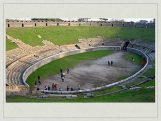 The document provides an overview of notable examples of Roman architecture from different periods, including amphitheaters and forums in Pompeii and Rome. Key structures mentioned are the Pompeii Amphitheatre, Pont-du-Gard aqueduct in Nimes, Ara Pacis altar in Rome, House of the Vettii and Colosseum in Rome, Trajan's Forum and Column in Rome, the Pantheon, and the Arch of Constantine.