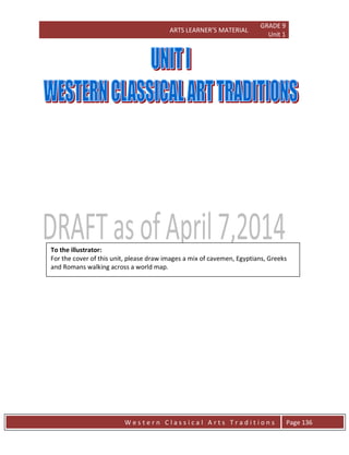 The document provides information about Western classical art traditions from prehistoric to medieval periods. It includes instructions for an illustrator to create a cover drawing showing cavemen, Egyptians, Greeks and Romans walking across a world map. The text then outlines learning standards and objectives related to understanding features of Western music and art. It provides descriptions of art from the Prehistoric Era including cave paintings, Ancient Egyptian paintings from tombs, and Classical Greek paintings on vases and panels. Examples of Roman mosaics and frescoes are also mentioned. Finally, the document discusses Byzantine and Romanesque religious paintings from the Medieval Era.