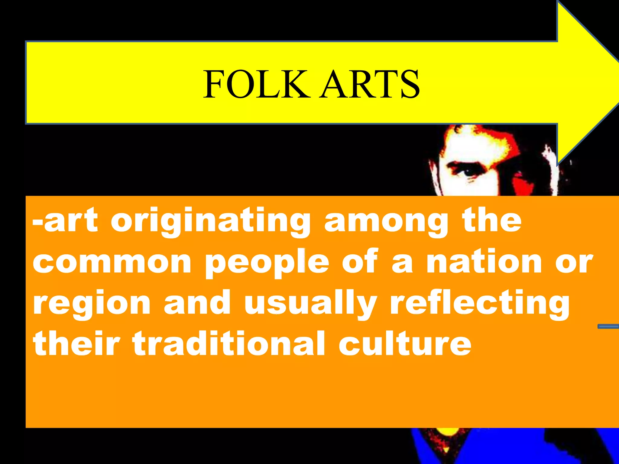 This document provides an overview of folk arts from different regions in the Philippines, summarizing key art forms, crafts, textiles, and cultural traditions. It describes motifs, looms, dyes, and other techniques used in weaving fabrics like inabel cotton from Ilocos and sinisiwan cloth from Bontoc. Jewelry, headgear, belts, and other accessories worn by ethnic groups are outlined. Distinctive festivals, dances, costumes, masks, and decorations celebrated in regions such as Quezon, Pampanga, Rizal, and Palawan are highlighted. The folk arts reflect the traditions and aesthetics of the Philippines' diverse cultural communities.
