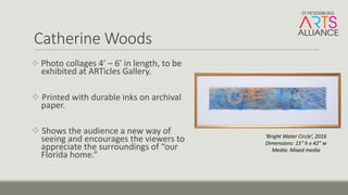 This document profiles 12 individual artists who have been selected for grants from the 2016 Individual Artist Grant Program. It provides details about each artist's proposed projects, which include photography, sculpture, opera, film, and murals. The projects will take place between June and November 2016 at various art galleries and performance spaces around St. Petersburg, Florida. The grants help support local artists and make the arts accessible to the community.