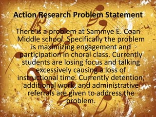 This document summarizes an action research project aimed at increasing student engagement in a 7th grade girls' chorus class. Over five weeks, the teacher tested different teaching methods including using warm-up CDs, having a student director, accompaniment CDs, and sectionals. Off-task behavior was tracked each week. The addition of these elements generally reduced off-task time, especially in the first 10-20 minutes of class. Student surveys found the top reasons for off-task behavior were talking, joking around, and other students. Technology like CDs and Smart Music, as well as small groups and student leadership roles, helped increase engagement.