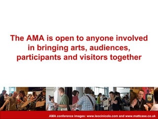 The document is an advertisement for the Association of Marketing and Advertising (AMA) which provides professional development opportunities for those working in arts and culture industries. The AMA offers a community for sharing knowledge and best practices, workshops and conferences to learn new skills, networking opportunities to meet industry experts, and career coaching and mentoring to further members' professional futures.