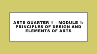 The document discusses the principles of design and elements of arts for an arts quarter module. It focuses on teaching 6 principles of design, which are likely balance, contrast, emphasis, movement, pattern, and rhythm based on the context. The principles of design are fundamental concepts for understanding and applying visual arts.