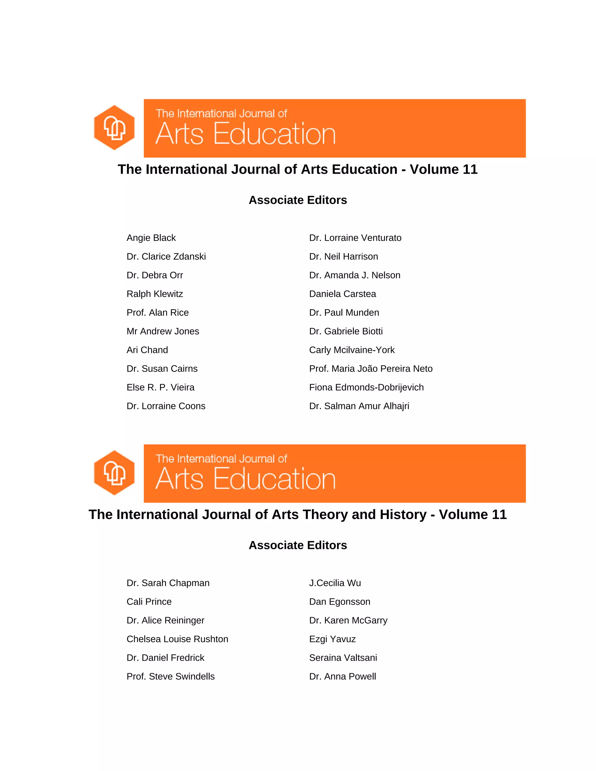 This document lists the associate editors for four different journals: The International Journal of Arts Education - Volume 11, The International Journal of Arts Theory and History - Volume 11, The International Journal of New Media, Technology, and the Arts - Volume 11, and The International Journal of Social, Political, and Community Agendas in the Arts - Volume 11. Each section lists between 20-40 associate editors for their respective journal and volume.