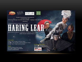 The document provides an overview of the theater industry in the Philippines. It discusses several prominent theater groups in the country, including PETA, Tanghalang Pilipino, Repertory Philippines, Trumpets, New Voice Company, and the Philippine Opera Company. It also outlines some of the basic roles required in a stage production, such as the producer, director, playwright, set designer, lighting designer, and costume designer. Finally, it proposes an activity for students to experience theater by watching and analyzing a live or recorded play.