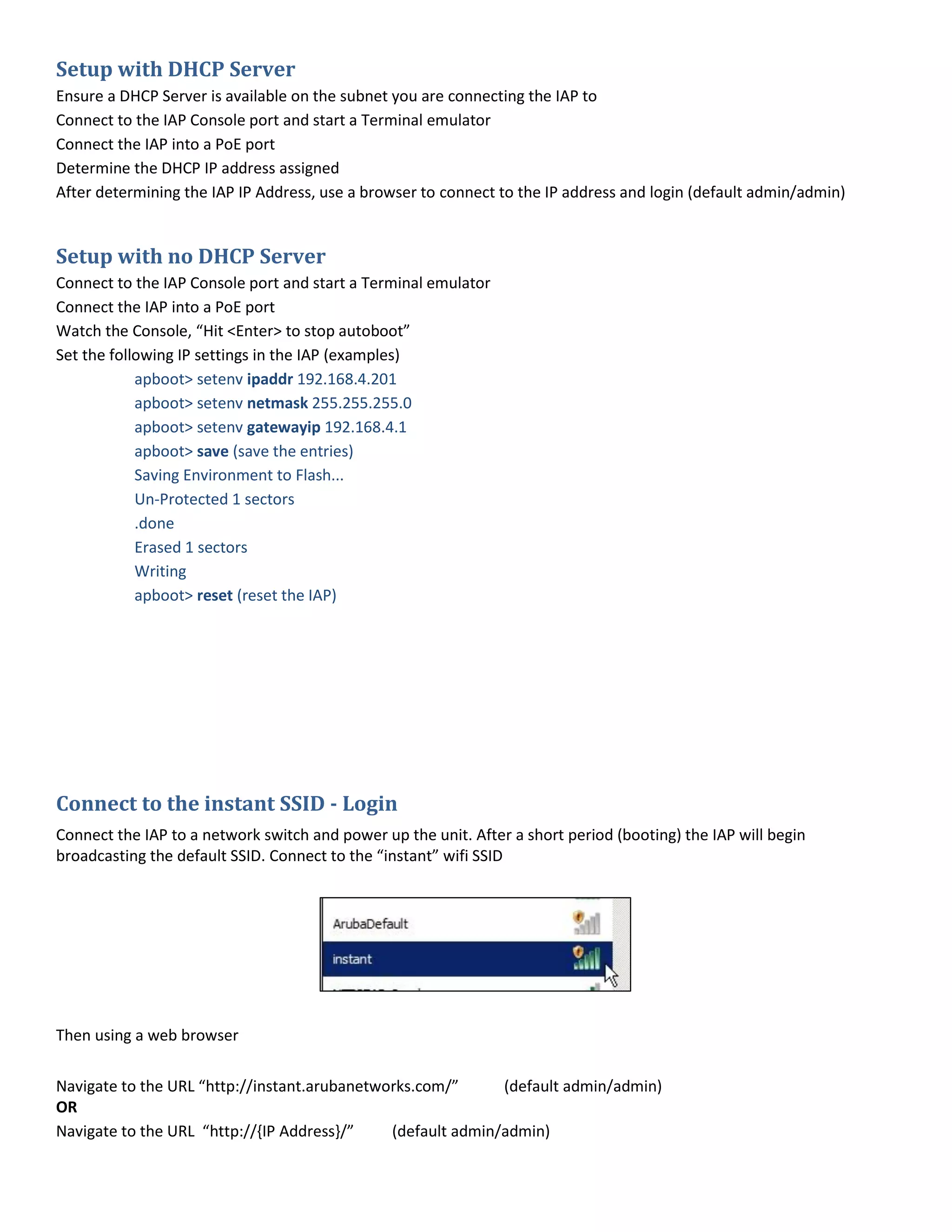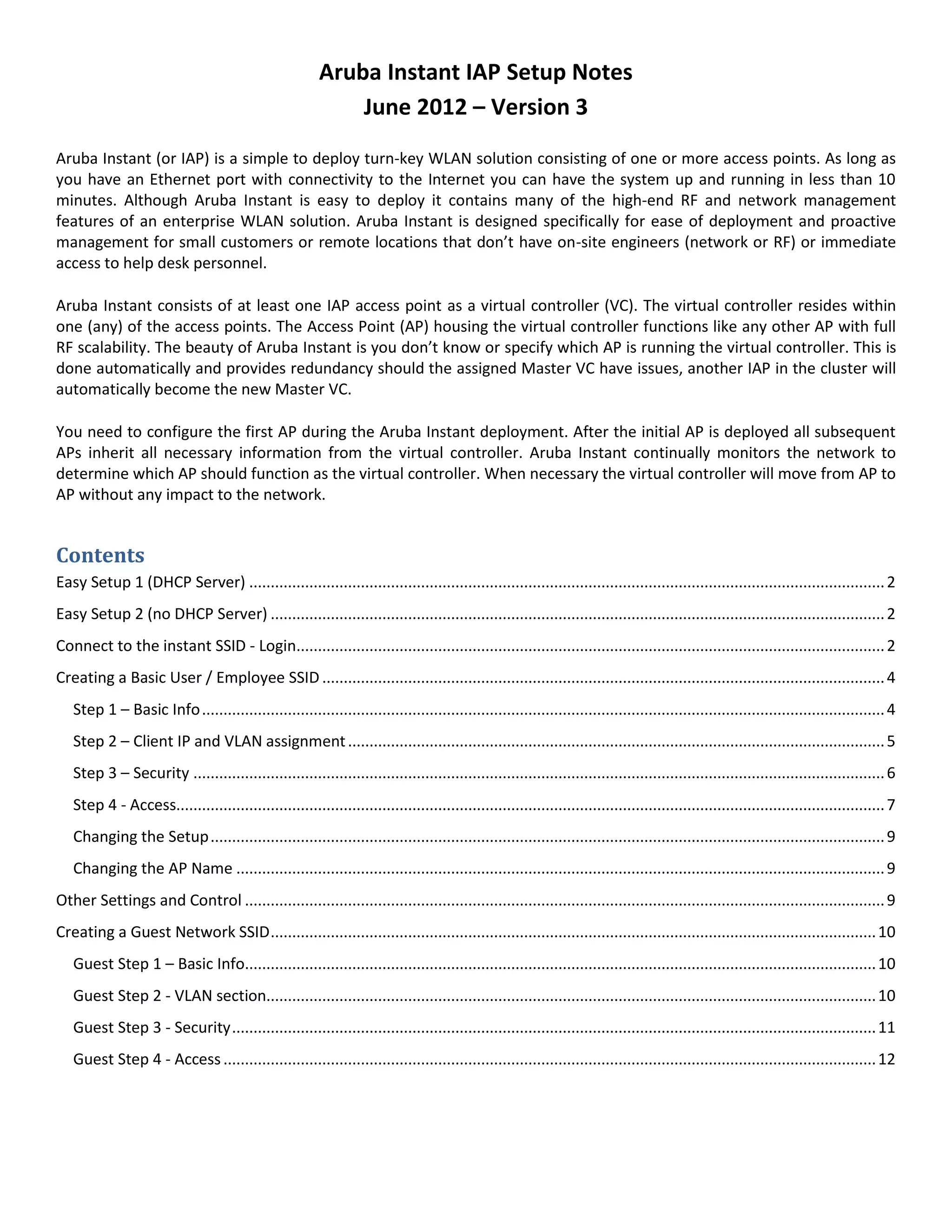 The document provides setup instructions for deploying and configuring an Aruba Instant wireless network. It describes how to set up the initial access point which will run the virtual controller software. Additional access points will automatically inherit settings from the virtual controller. The instructions also cover creating basic employee and guest wireless networks with options for security, client IP assignment, and access controls. The process involves a simple four step configuration for each network's basic info, IP settings, security, and access rules.