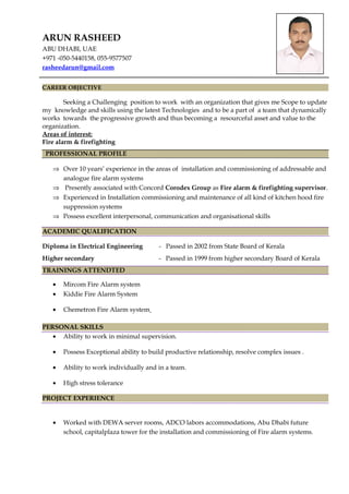 Arun Rasheed is seeking a challenging position in fire alarm and firefighting where he can utilize his over 10 years of experience installing and commissioning addressable and analogue fire alarm systems. He has worked on numerous projects in the UAE including for DEWA, ADCO, and Abu Dhabi Future School. Currently he is the fire alarm and firefighting supervisor for Concord Corodex Group in Abu Dhabi and the site supervisor for the Etihad Rail Project. He has a diploma in electrical engineering and additional training in various fire alarm systems.