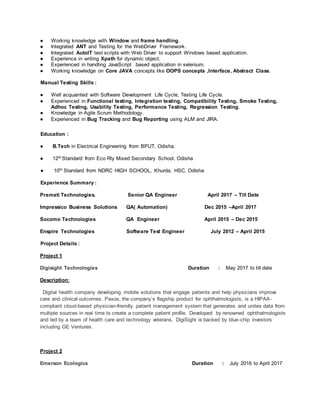 Arun Kumar Sahoo has over 5 years of experience in software testing with a focus on automation testing using Selenium WebDriver. He has expertise in test automation, API testing, mobile app testing, and manual testing. His technical skills include Selenium, Java, SQL, and test reporting tools like TestNG. He has worked on projects in various domains including healthcare, lending, transportation, and ERP.