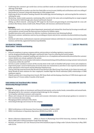 Arunabha Das is a banking professional with nearly 5 years of experience in retail banking operations, commercial operations, loans and advances, and financial reporting. He is seeking a middle management position where he can apply his experience in banking processes. He has experience in areas such as business development, client relationship management, wealth management, and team management. He is proficient in English, Hindi, and Bengali and holds an MBA in finance and marketing.