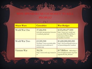 The document argues that peace is preferable to war for several reasons. It notes the massive casualties and costs of World War 1, World War 2 and the Vietnam War while quoting Einstein and Kennedy about the dangers of war. The document includes disturbing images to show the cruelty of war and advocates for peace instead of fighting over money, land and materials. In an acrostic poem, it states that we destroy lives and homes around the world through fighting and the pain of war cannot be explained or forgotten.