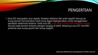 Arus DC adalah arus searah yang mengalir dari kutub negatif ke kutub positif, digunakan dalam berbagai peralatan elektronik seperti baterai dan gadget. Meskipun lebih praktis untuk penggunaan sehari-hari, arus DC tidak stabil dan sulit ditransfer dalam jarak jauh dibandingkan arus AC. Arus AC lebih efisien untuk distribusi energi karena dapat ditransfer dalam jarak jauh dan memiliki tegangan yang stabil.