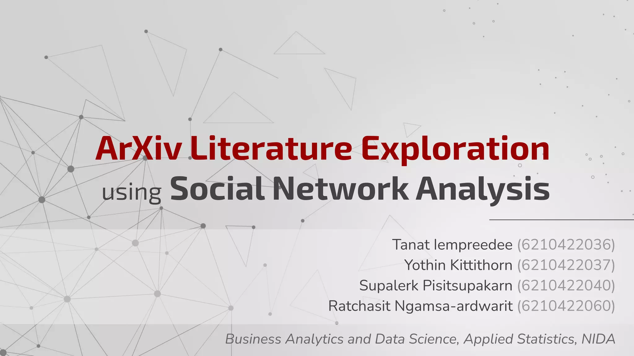 This document summarizes an analysis of the ArXiv dataset using social network analysis techniques. Key findings include: