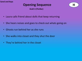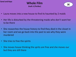 The document contains a shot list for a film with 17 scenes. It provides the time duration for each shot, the scene details, camera shot types (e.g. close-up, mid, establishing), descriptions of the shots, and any required props or costumes. The shots follow a woman as she walks home carrying a bag, enters her house and bedroom, lights candles, prays, and then becomes possessed, showing her actions and objects like her hands and the bag through different camera angles and perspectives.