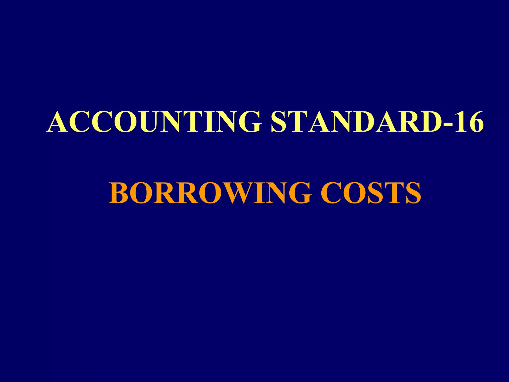 Accounting Standard 16 outlines the accounting treatment for borrowing costs related to qualifying assets. It requires that borrowing costs directly attributable to the acquisition, construction or production of a qualifying asset be capitalized as part of the cost of that asset. Other borrowing costs should be recognized as an expense. Capitalization of borrowing costs should commence when funds are borrowed and activities to prepare the asset are underway, and cease when the asset is ready for its intended use or sale. Certain disclosures regarding capitalized borrowing costs are also required.