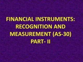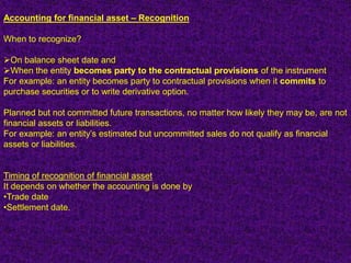 Financial assets must be recognized on the balance sheet date if the entity has become a party to the contractual provisions of the instrument. There are two approaches to recognition - trade date accounting and settlement date accounting. Trade date accounting recognizes assets and liabilities on the trade date, while settlement date accounting uses the settlement date. The appropriate accounting also depends on how the financial asset is classified and whether it is measured at amortized cost, fair value through other comprehensive income, or fair value through profit or loss.