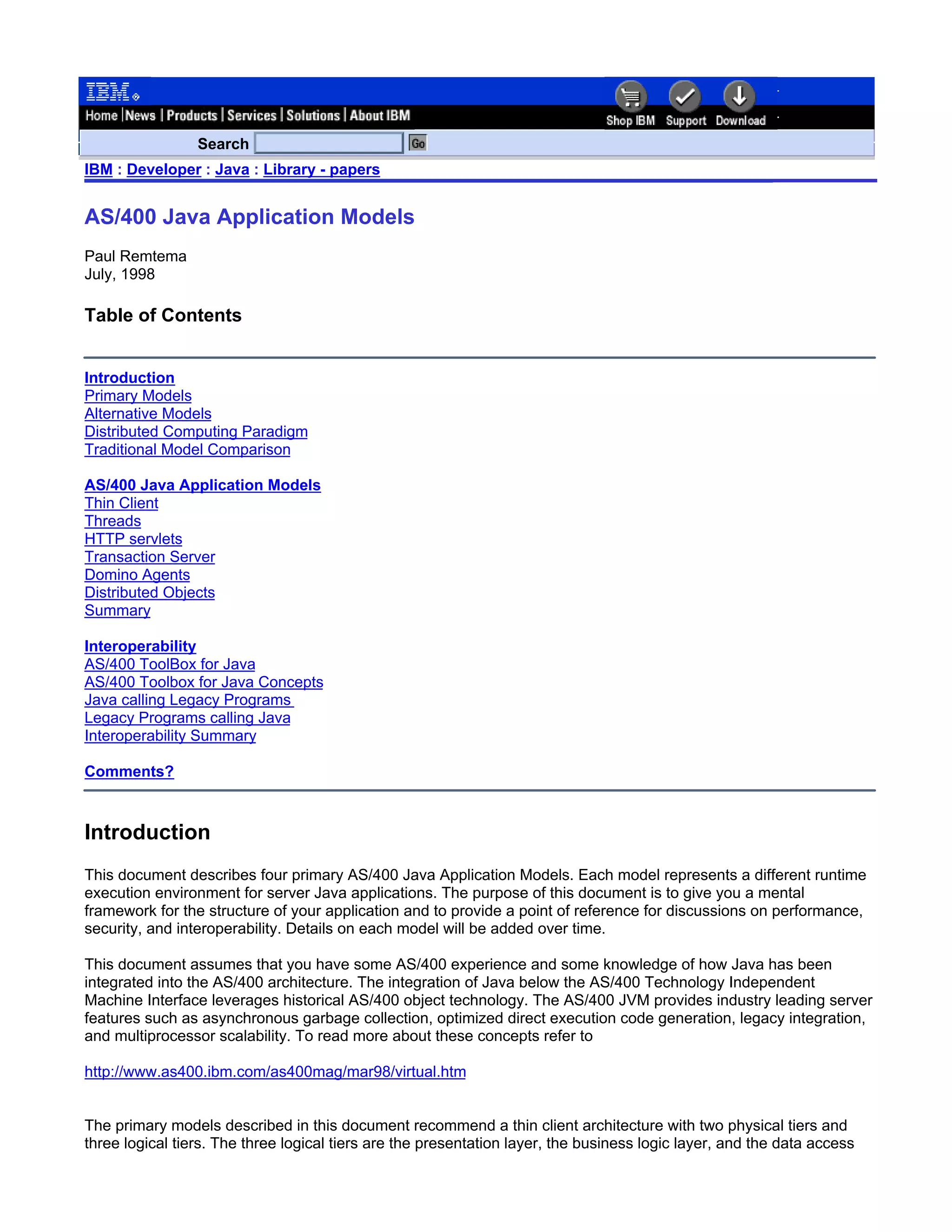 This document describes four primary models for developing Java applications on the AS/400: HTTP servlets, transaction serving, Domino agents, and distributed objects. It compares these models to the traditional interactive job structure and discusses how each handles system services like transactions and security. The models provide different levels of services, with distributed objects eventually providing the most complete environment similar to traditional models.