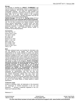 LOCTITE® 7471TM is an amine and thiazole based activator solvent containing acetone and isopropanol that is used to accelerate the cure of LOCTITE® anaerobic adhesives, especially for applications with passive metals or inert surfaces and large bond gaps. It must be handled as a flammable material and can affect some plastics or coatings, so surface compatibility should be checked before use. The activator is applied to surfaces to be bonded and allowed