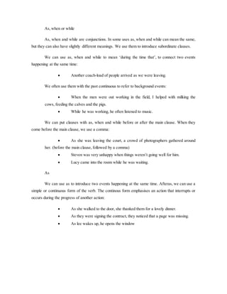 This document discusses the conjunctions "as", "when", "while", "because", and "since". It explains their different meanings and uses, including: